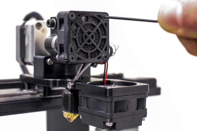 Remove the top right screw on the extruder motor fan with the 2mm hex wrench.